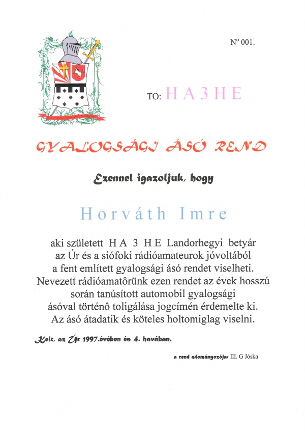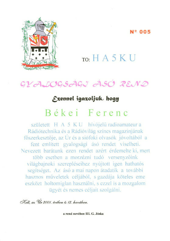 A GYALOGSÁGI ÁSÓ RENDET A SIÓFOKI RÁDIÓKLUB ALAPÍTÓJA HÍVTA ÉLETRE. RÁDIÓAMATŐRÖK ÉS A RÁDIÓAMATŐR SPORTOT TÁMOGATÓ BARÁTAINK JUTALMAZÁSÁRA, AKIK HOSSZÚ ÉVEKEN KERESZTÜL SEGÍTETTÉK A KLUBOT AZ EREDMÉNYEINK MAGASABB SZINTRE EMELÉSE ÉRDEKÉBEN. MAGYARRA FORDÍTVA: KIÁSTAK BENNÜNKET A MÉLYBŐL, HOGY ÚJRA A FELSZÍNEN LEHESSÜNK. ÁLTALÁBAN SZERÉNYEN EGY OKLEVELET, EGY PÁR SIÓFOKI SAJÁT KÉSZÍTÉSŰ KOLBÁSZT ÉS MELLÉ SAJÁT TERMÉSŰ FÉL LITER TÖRKÖLYPÁLINKÁT, S EZT DÍJNYERTES VÖRÖSBORRAL KÖRÍTVE KAPJÁK AJÁNDÉKUL. A MAI VILÁGBAN EZ IS EGYFÉLE ELISMERÉS, AMIT SZÍVESEN FOGADNAK SEGÍTŐ BARÁTAINK ÉS TOVÁBBRA IS SZÁMÍTUNK AKTÍV TÁMOGATÁSAIKRA.