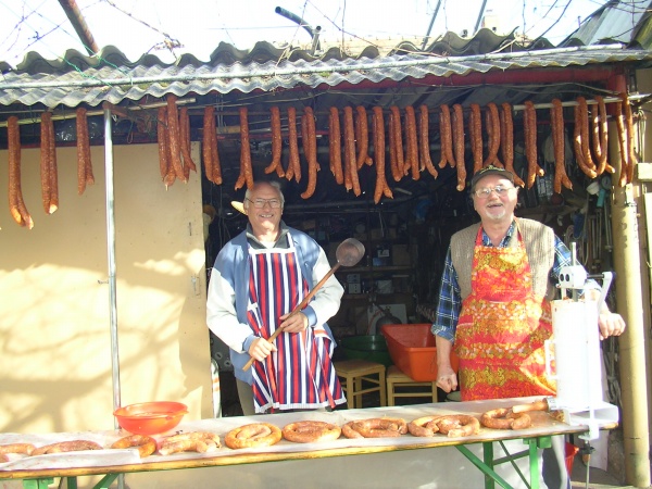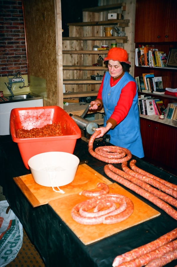 A csapat téli kolbász és hurka töltése, HA3HE Imre HA3GJ Jóska